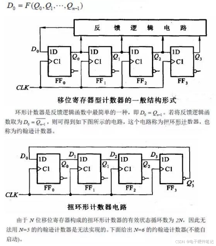 的条件下提高环形计数器的电路状态利用率,只能从改变反馈逻辑电路上想办法。 事实上任何一种移位寄存器型计数器的结构都可表示为如下图所示的一般形式。其中反馈逻辑电路的函数表达式可写成: