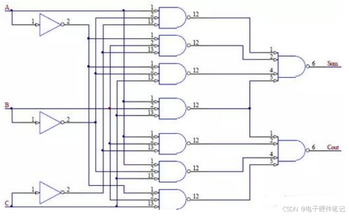 设加数为 A 和 B ,低位进位为 C,和为 Sum ,进位位为 Cout,则用与非门设计的全加器如下图: