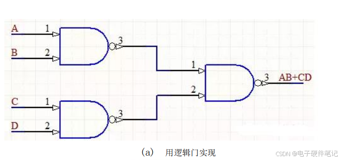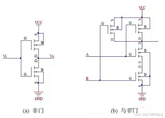 此类题目都可以采用一种做法,首先将表达式全部用与非门和非门表示,然后将用 CMOS 电路实现的非门和与非门代入即可。非门既可以单独实现,也可以用与非门实现(将两输入端接在一起即可 )