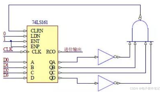 如果想设计 15 进制,只要在 QD QC QB QA=1110 时将 CLRN 置低即可。