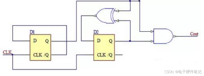 由于是 4 进制计数器,因此只需两个 D 触发器即可,记进位输出为 Cout,时钟信号为 CLK,则利用 D 触发器和门电路组成的 4 进制计数器如下图: