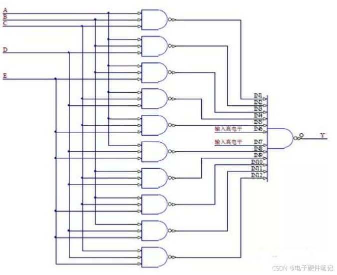 记 A 赞成时 A=1,反对时 A=0 ;B 赞成时 A=1,反对时 B=0 ;C、 D、E 亦是如此。由于共 5 人投票且少数服从多数,因此只要有三人投赞成票即可,其他人的投票结果并不需要考虑。基于以上分析,下图给出用与非门实现的电路: