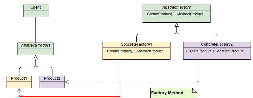 上面两种模式不管工厂怎么拆分抽象,都只是针对一类产品,如果需要多种产品,那就需要使用抽象工厂模式。抽象工厂模式通过在AbstarctFactory中增加创建产品的接口,并在具体子工厂中实现新加产品的创建,当然前提是子工厂支持生产该产品。否则继承的这个接口可以什么也不干。
