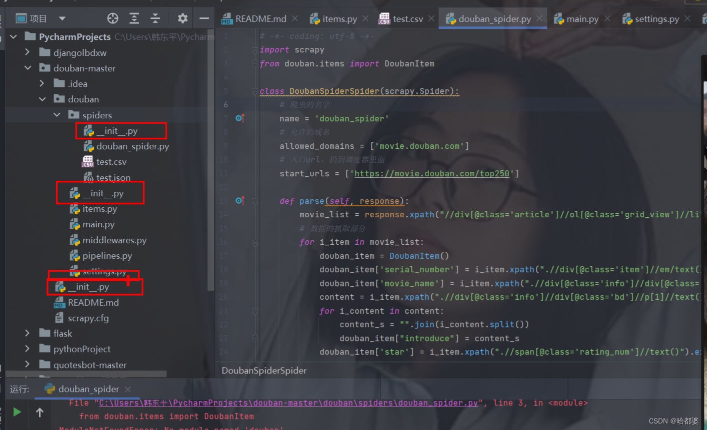 File "C:\Users\韩东平\OneDrive\桌面\spider2017\spider2017\spiders\douban.py", line 3, in <module>