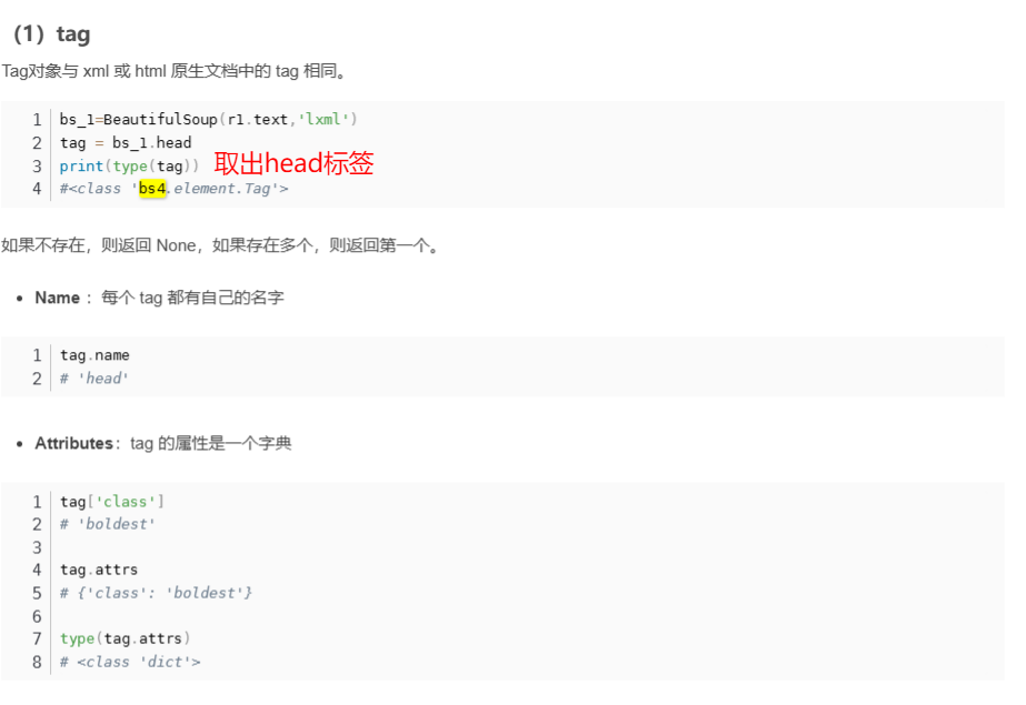 1. Tag对象:代表 HTML或XML文档中的标签,每个Tag对象可以由多个属性组成;