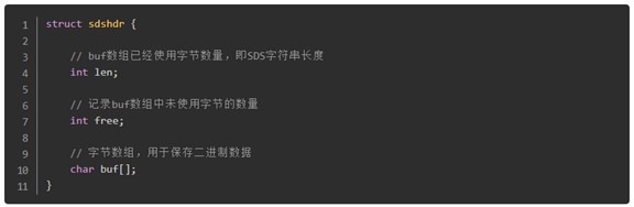 基于C语言中传统字符串的缺陷,Redis自己构建了一种名为简单动态字符串的抽象类型,简称SDS,其结构如下: