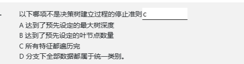 选项C不是决策树建立过程的停止准则。通常来说,在构建决策树的过程中,需要不断地选择最优的划分特征、计算信息增益或其他评价指标、生成子节点等操作,直到满足某个停止准则才会停止并输出决策树模型。