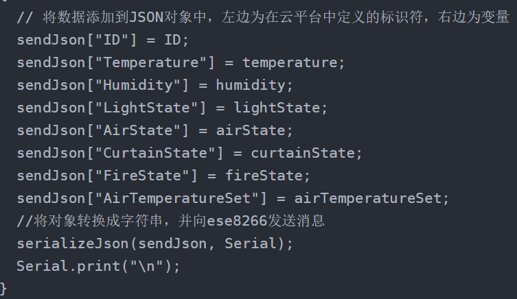 // 将数据添加到JSON对象中,左边为在云平台中定义的标识符,右边为变量