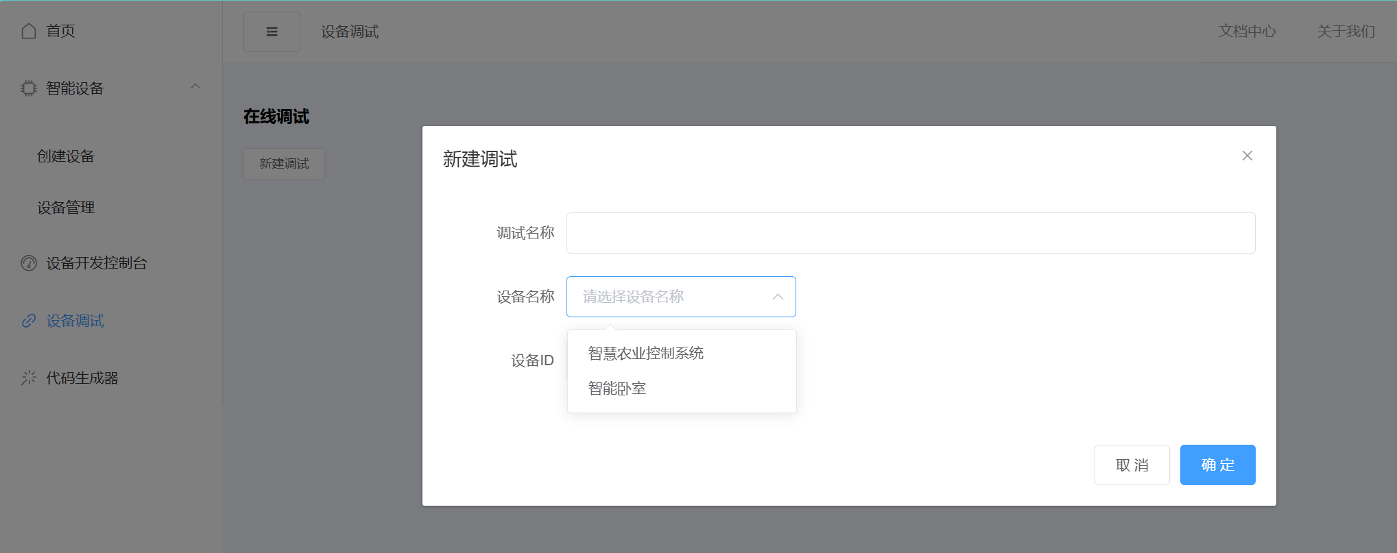 在设备调试那里选择新建调试,然后随便起一个调试名字,选择要调试的设备,然后设备ID会自动填充,紧接着数据就会上传到云平台中,手机中点击右上角+号,输入设备码就可以添加设备,同时也会同步数据。