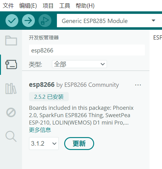 进入工具->开发板->开发板管理器添加esp8266开发板(我的是已经安装上的)