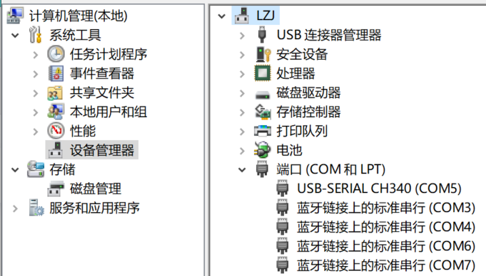这里的下载只需要用一根数据线连接电脑和ESP8266,然后选择USB对应的端口,查看端口的操作为:右键此电脑——管理——设备管理器——端口。图示如下。