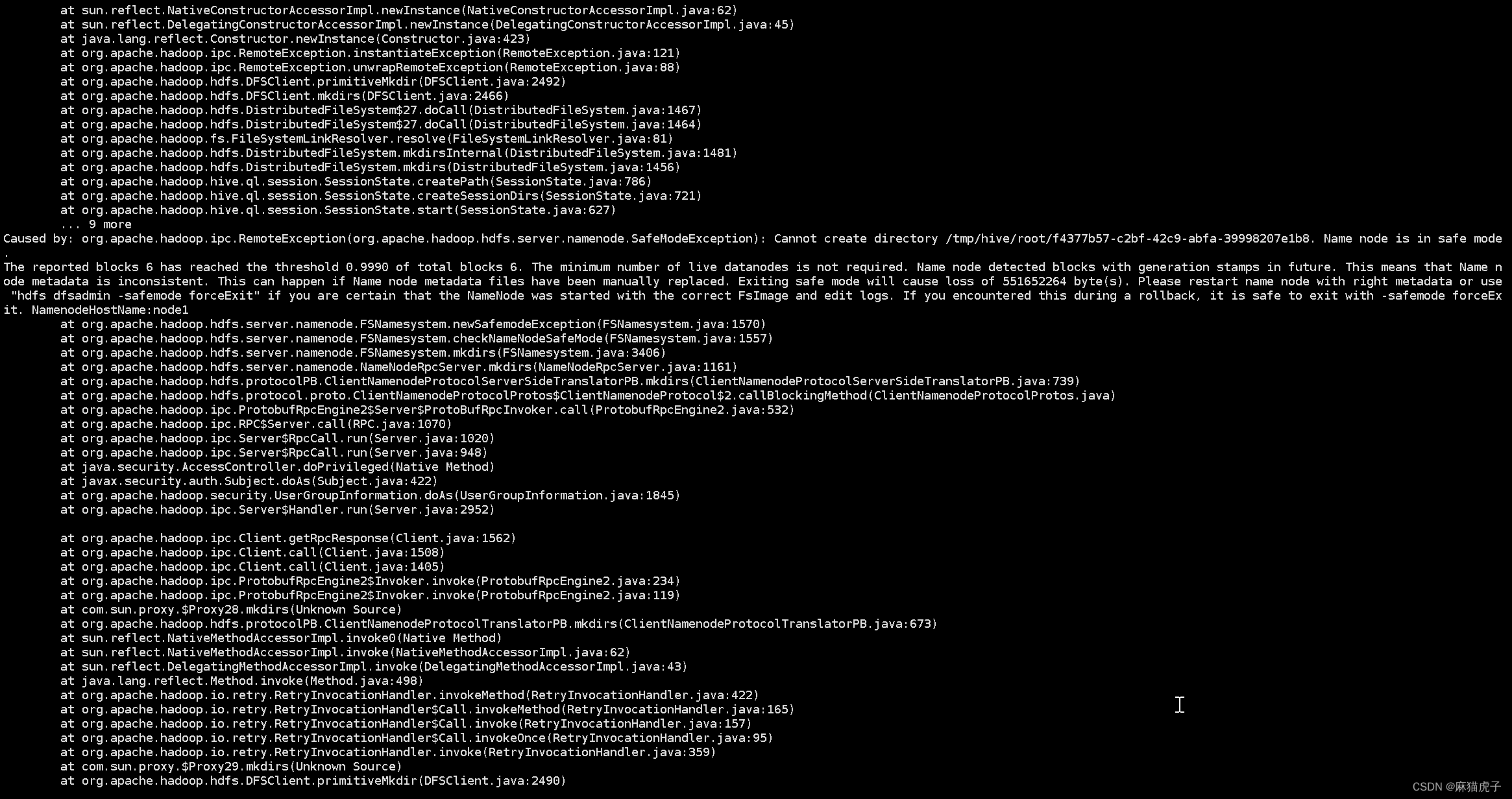 Hadoop集群故障排查之SafeModeException Caused by: org.apache.hadoop.ipc.RemoteException(org.apache.hadoop.hdfs.server.namenode.SafeModeException): Cannot create directory /tmp/hive/root/98733d46-946e-4de8-95c1-f2a4c9270ca9. Name node is in safe mode.The reported blocks 6 has reached the thresh