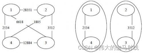 【输入输出样例说明】罪犯之间的怨气值如下面左图所示,右图所示为罪犯的分配方法,市长看到的冲突事件影响力是3512(由2 号和3 号罪犯引发)。其他任何分法都不会比这个分法更优。