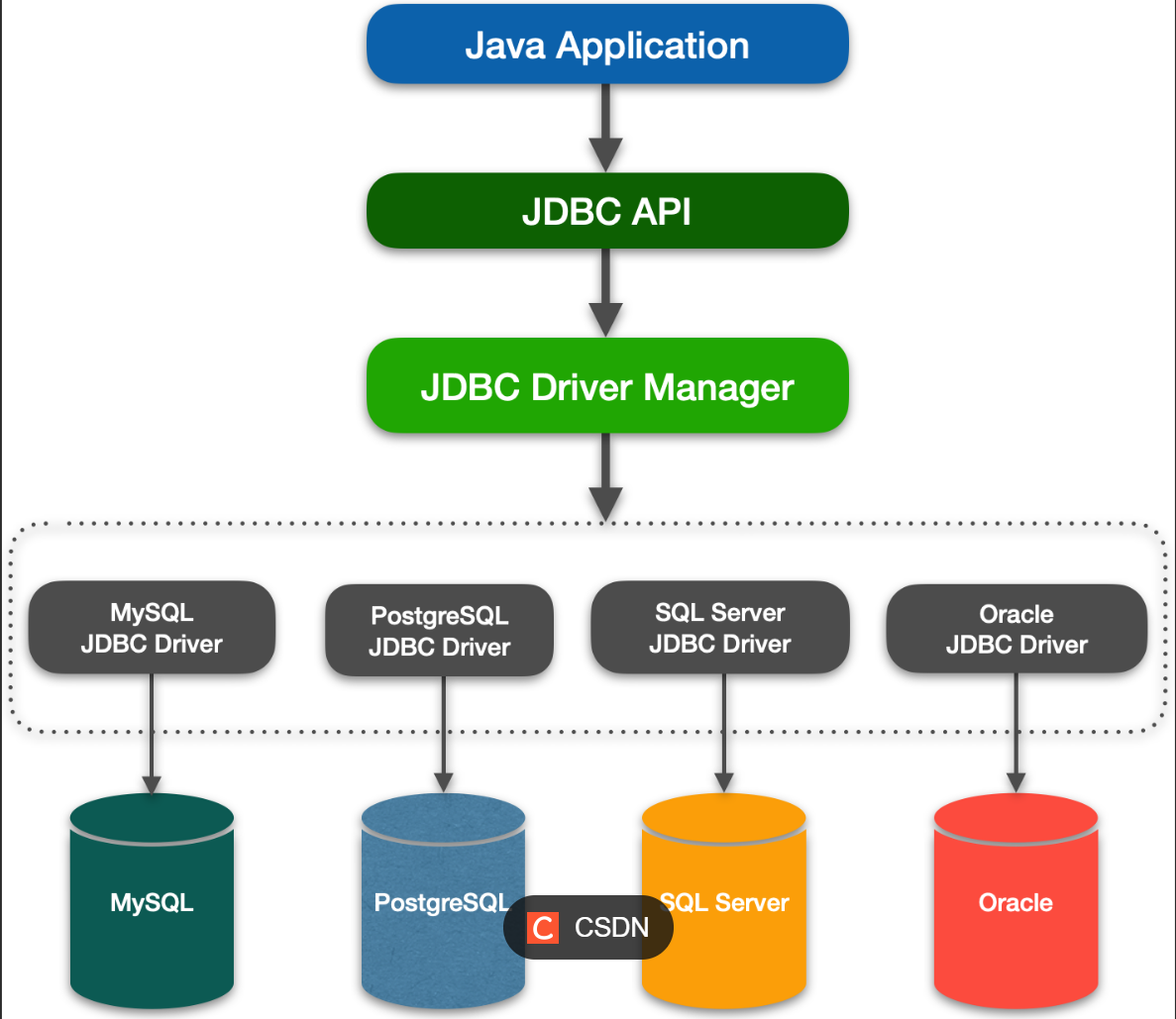 一篇学会JDBC JDBC(Java Database Connectivity,Java数据库连接)是一个Java API,可以与任何关系型数据库进行交互。它由一组用Java语言编写的类和接口组成,提供了一种标准的方法,允许Java程序发送SQL语句到数据库并处理返回的结果。:JDBC定义了一系列的标准接口和类,使得Java应用程序能够以一种统一的方式与不同的数据库进行交互。:通过JDBC,开发者可以使用相同的代码连接到不同的数据库系统,如MySQL、Oracle、SQL Server等。