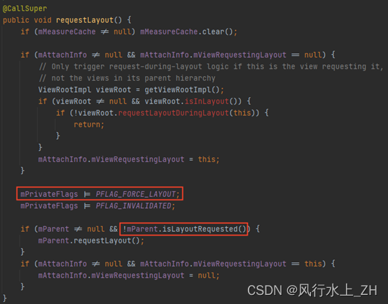 调用View的requestLayout方法,会先设置PFLAG_FORCE_LAYOUT标志,这个标志会在layout的时候进行清楚。当这个标记存在时,在下面调用mParent.isLayoutRequested()是会返回true,这样就不会再向上调用requestLayout。Android这样设计的目的是避免多次触发重绘。