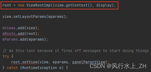 继续看WindowManagerGlobal的addView方法。在这个方法中,我们看到”new ViewRootImpl” 这是ViewRootImpl被创建的位置,也是唯一被创建的位置。