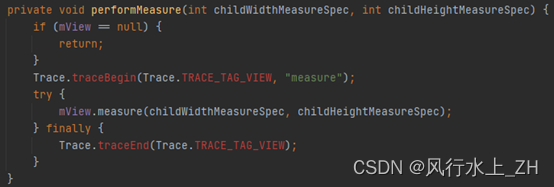 单独看一下performMeasure方法。这个方法会调用到View的measure()方法。然后按照view的层级,进行自上而下的测量。我们自定义view时所实现的onMeasure方法,就是做这个事情。测量将view的宽高属性记录在measureSpec中,完成测量。