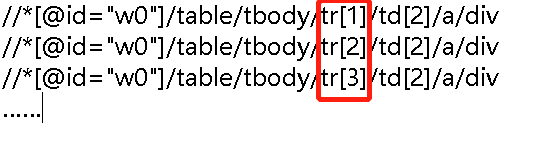 //*[@id="w0"]/table/tbody/tr/td[2]/a/div,直接去掉tr后面的序号,可以获得通用的xpath信息。剩下的套路很熟悉,用for循环取出返回列表中的数据就可以了。