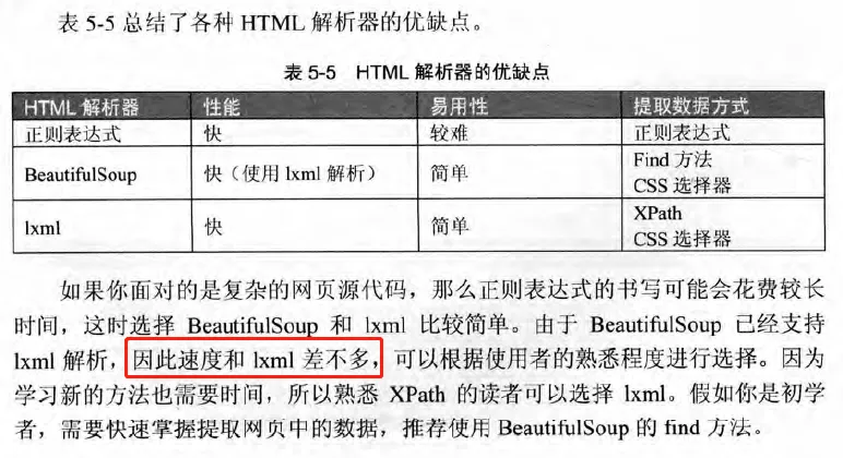 BeautifulSoup和Lxml在网页解析和信息提取方面都是重量级的选手,而且两种方法的学习成本都不高。借用一本教材里对三种方法的对比: