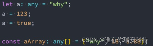 我们可以对any类型的变量进行任何的操作,包括获取不存在的属性、方法;