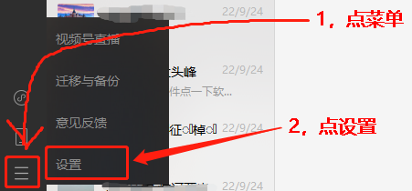 一、登录电脑版微信,然后点左下角【菜单】-【设置】