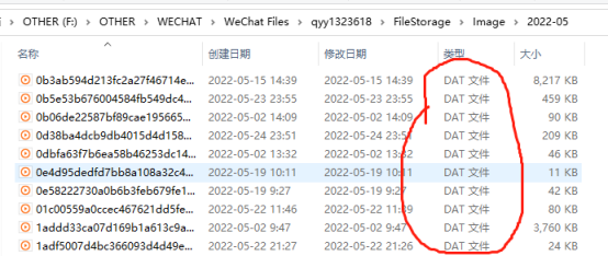 七、清理了视频,下一个占用空间最大的,就是图片了,但是图片是加密保存的,都是dat文件,在上面第五步的文件夹里可以看到它保存在哪里,dat文件如下图