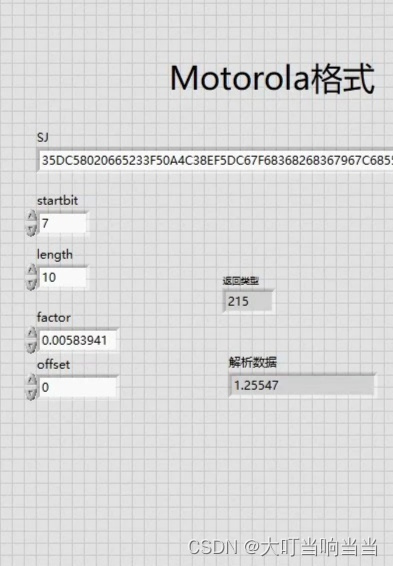 输入端:16进制报文数据、起始位、位长度、比例系数、偏移量;