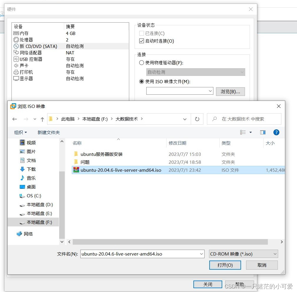 选择新CD/DVD(SATA)这一选项,插入之前下载的安装包,即ubuntu-20.04.6-live-server-amd64.iso