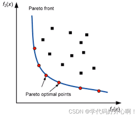 多目标优化遗传算法NSGA-Ⅱ 在接触编程之前,我们可能会在运筹学等相关教材中了解过多目标优化的知识, 其问题结构如下图所示:首先,要注意的是,决策变量要与每一个目标函数有关,假设x1、x2只与f1(x)有关,x3、x4只与f2(x)有关,那么这就不叫多目标优化问题,而应该叫做单目标优化问题。其次,每个目标函数之间要存在矛盾,比如目标函数f1(x)代表一台笔记本的性能和目标函数f2(x)代表一台笔记本的便携性。所谓鱼和熊掌不可兼得,在想要一台性能出色的笔记本必然会损失其便携性。