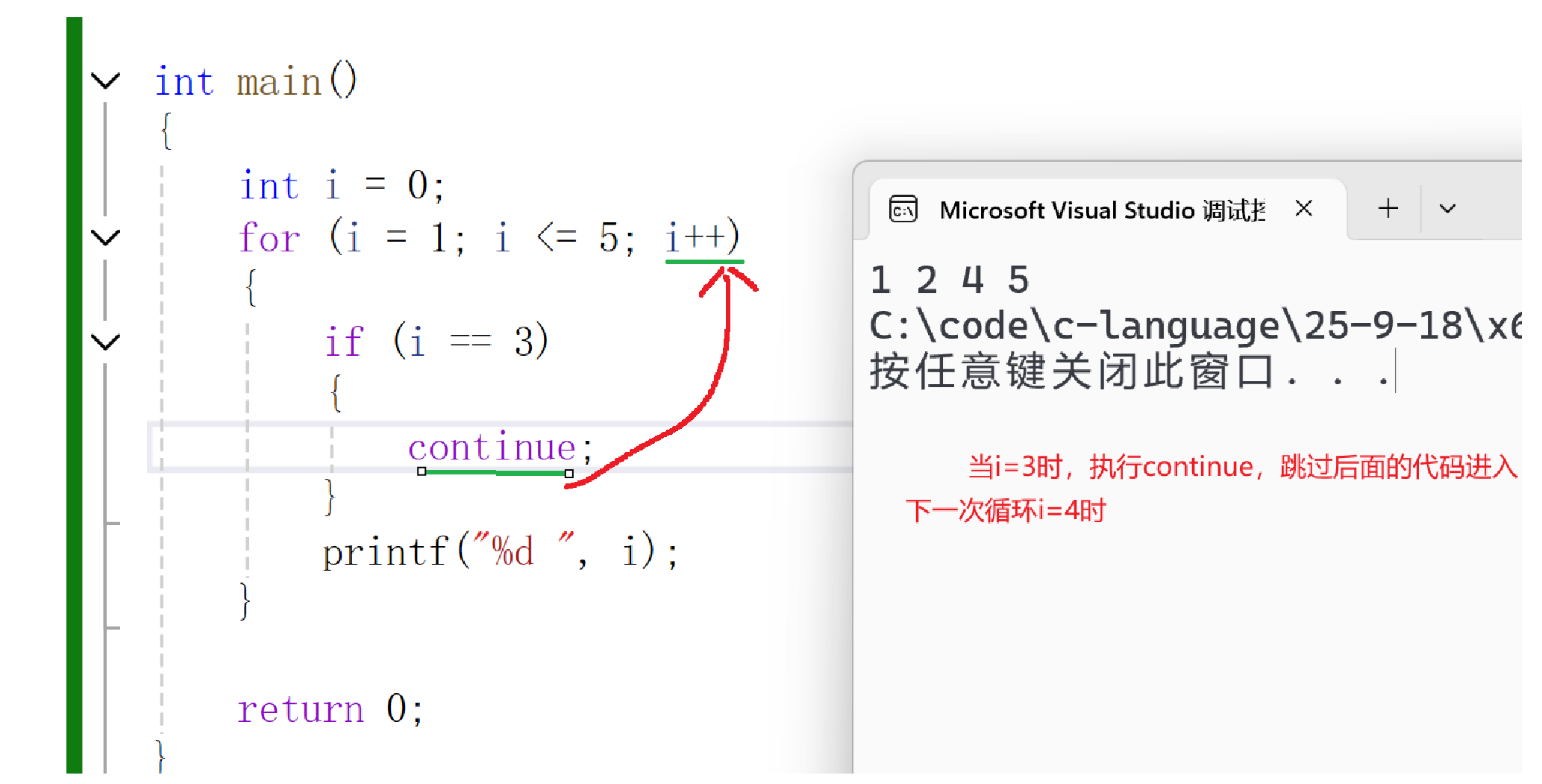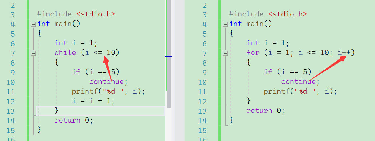 2. 而在右边这张图中,continue执行后会跳到for循环的调整语句部分 i++,使 i 变成6,使得程序正常执行,满足需求。