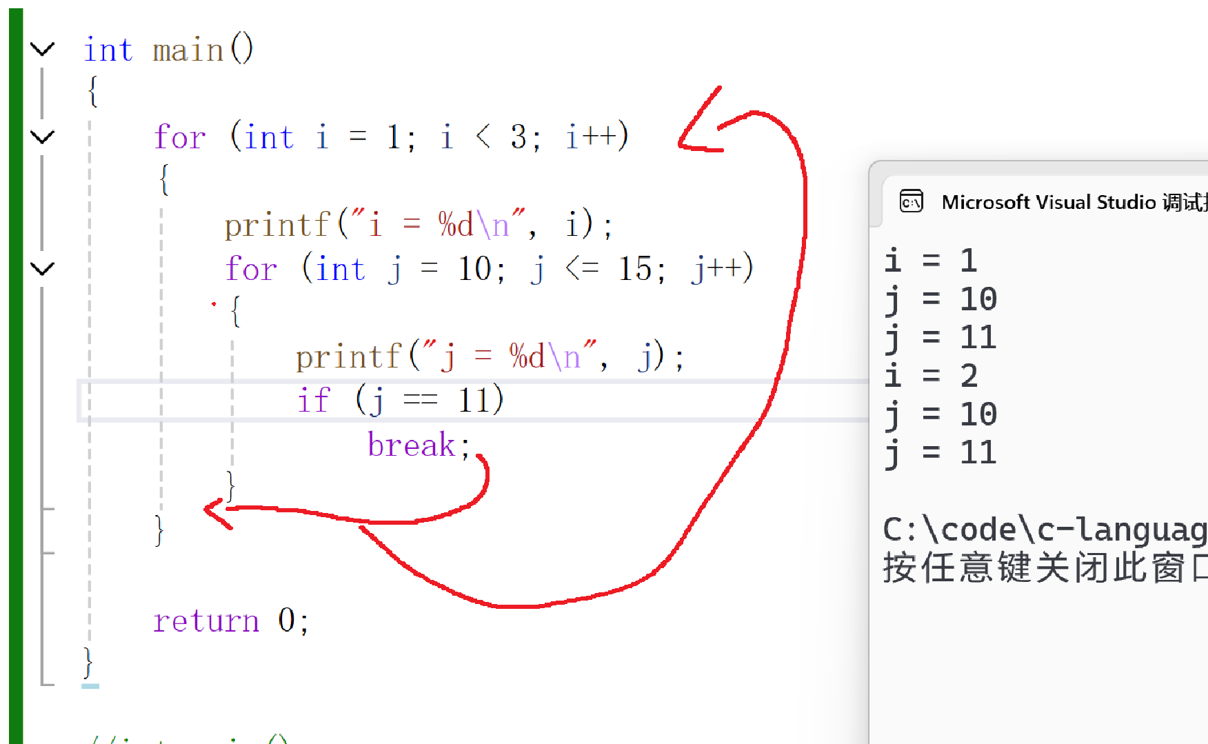 在循环执行的过程中,如果某些状况发生的时候,需要提前终止循环,也就是在实际开发中经常遇到的场景。C语言中 提供了 break 和 continue 两个关键字,就是应用到循环语句中的。