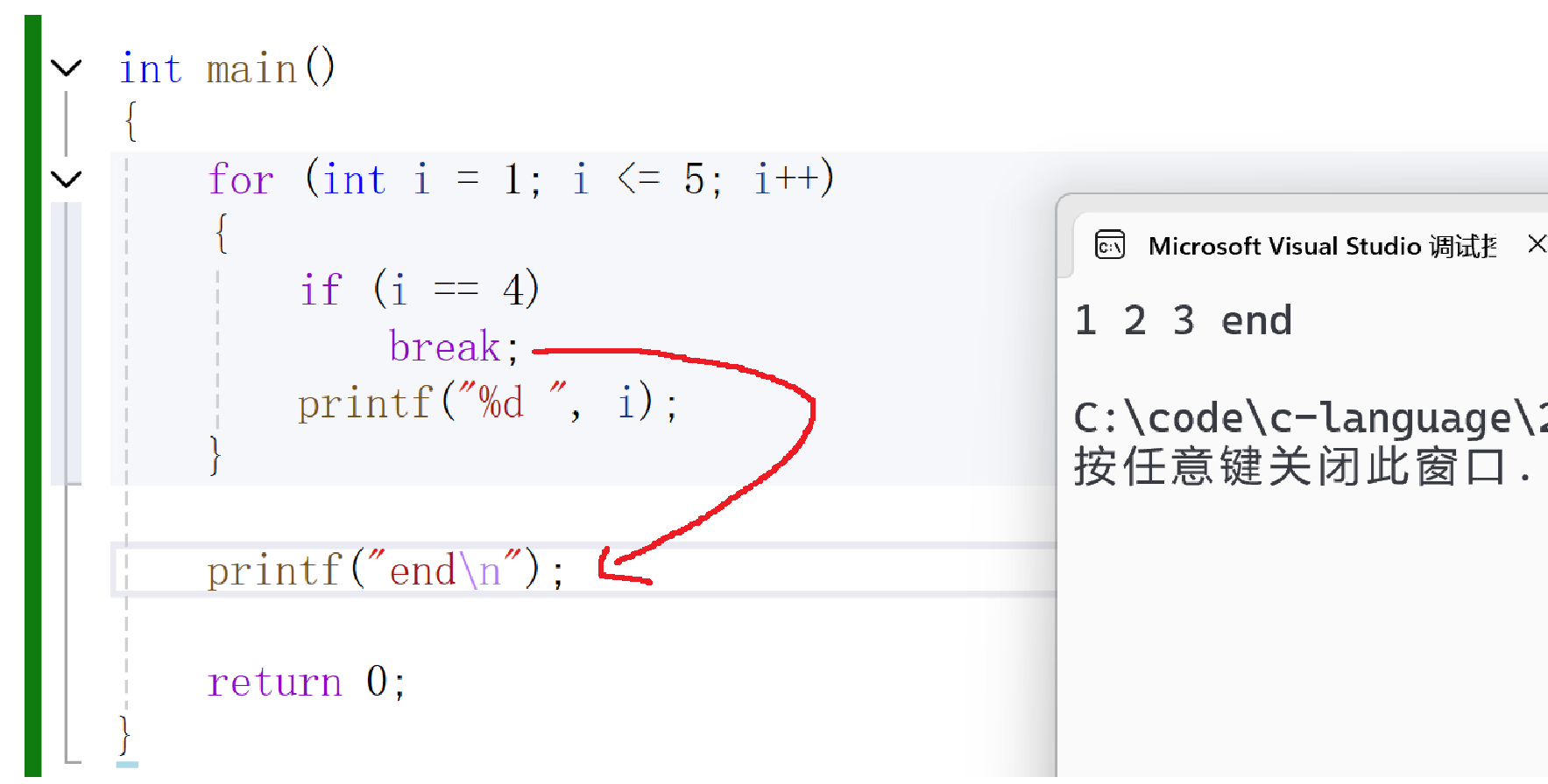 3.1 break 的作用是直接终止当前循环语句,只要 break 被执行,直接就会跳出循环,继续执行循环语句后面的代码。