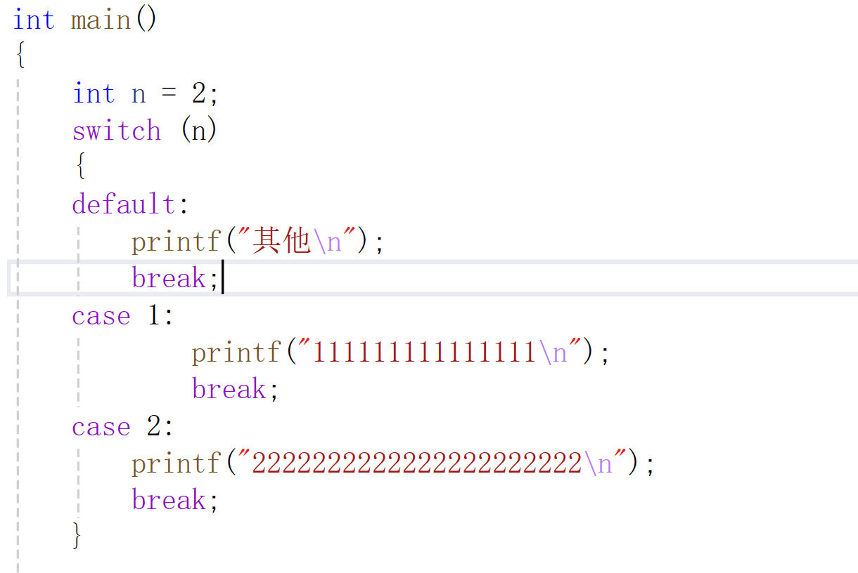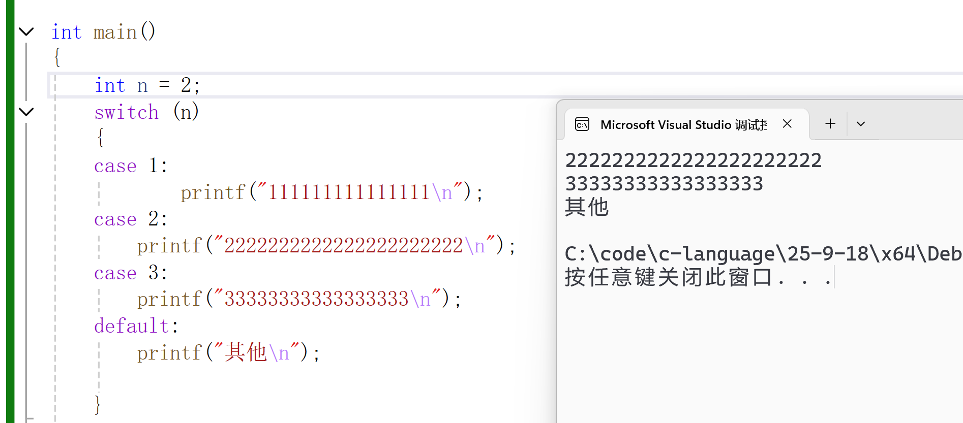 3. 每⼀个 case 语句中的代码执行完成后,需要加上 break ,才能跳出这个switch语句。如果有case语句和default语句后面没有加上break语句,就会导致顺序往下执行代码,直到走完switch当中的所有语句。