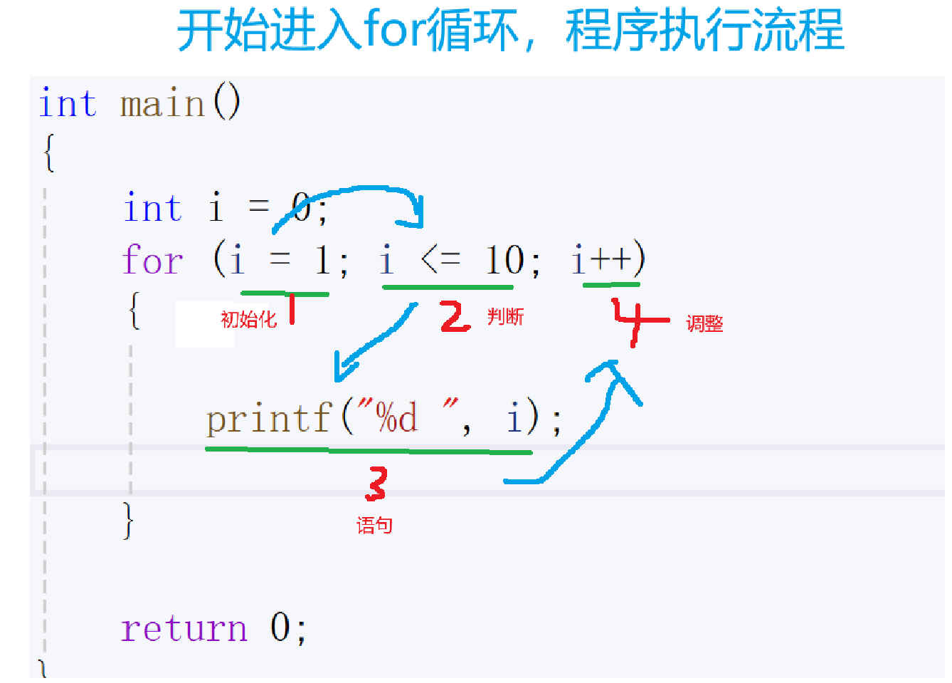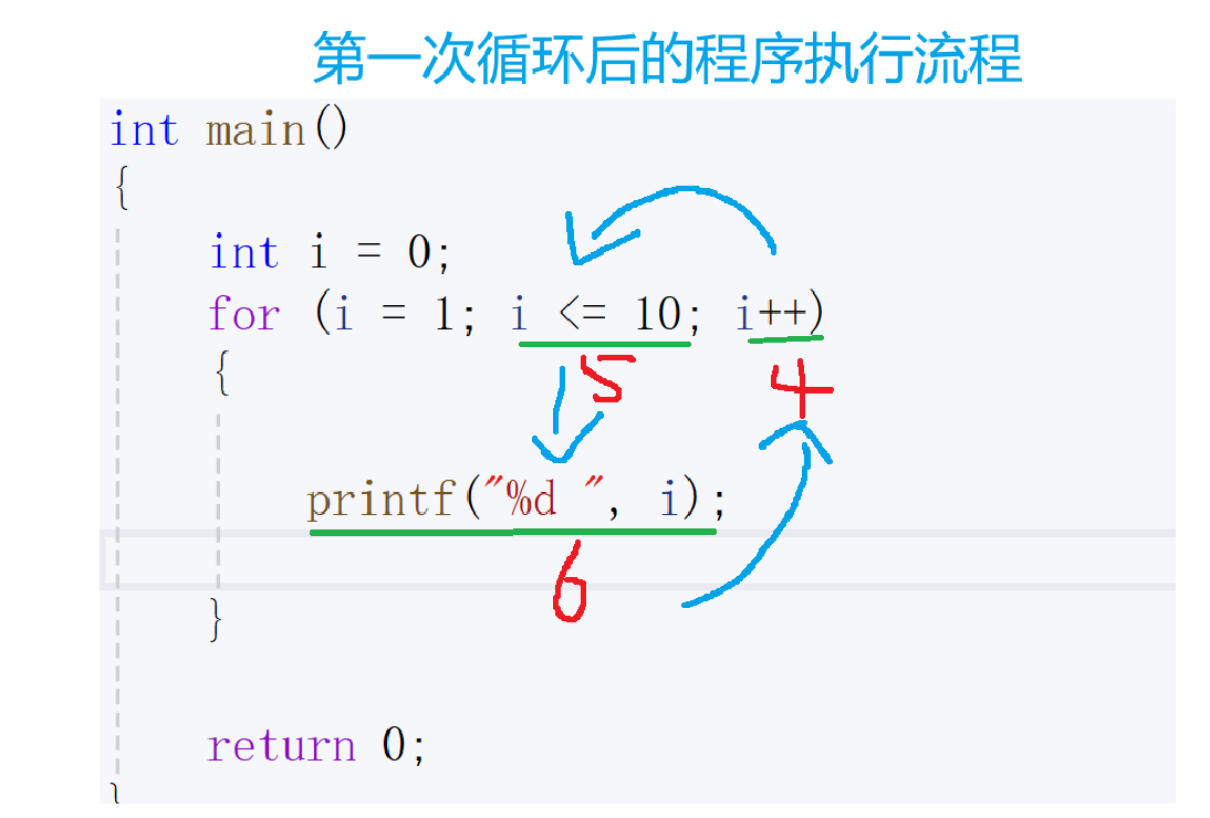 3. for循环的执行流程:在for循环中初始化语句只在刚进入循环时执行一次,后续便不在执行。在第一次循环结束后,便以4,5,6为流程一直反复循环执行,直到循环结束。