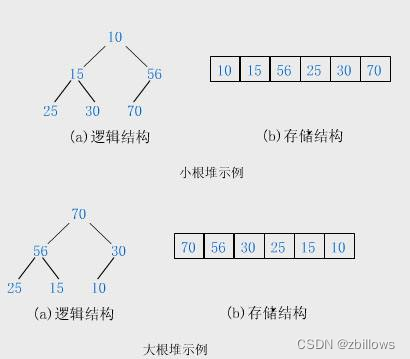如果有一个关键码的集合K = {k0,k1, k2,…,kn-1},把它的所有元素按完全二叉树的顺序存储方式存储 在一个一维数组中,并满足:Ki <= K2i+1 且 Ki<= K2i+2 (Ki >= K2i+1 且 Ki >= K2i+2) i = 0,1,2…,则称为 小堆(或大堆)。将根节点最大的堆叫做最大堆或大根堆,根节点最小的堆叫做最小堆或小根堆。