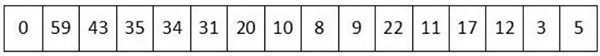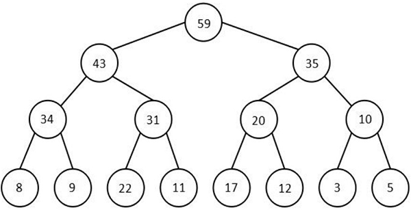 图 1 所示为大顶堆,位于根节点上的 59 是整个堆中最大的数。在堆排序中,我们需要把堆用一个数组的形式表示。