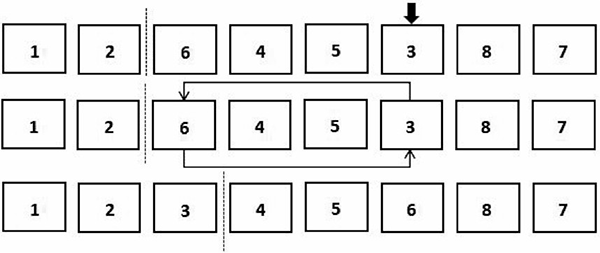 6) 继续重复以上步骤,直到所有元素都被加入到有序数组中。如图 9 所示,下面给出了确定第三小的数并将其排序的过程。