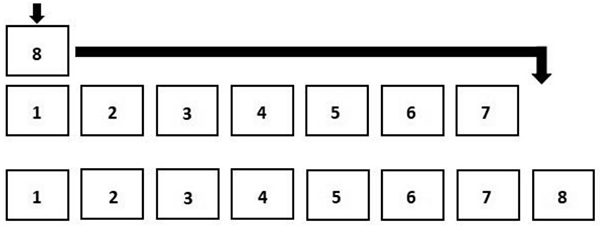 3) 如图 3 所示,重复上述步骤,当未排序数组中只剩下一个元素时,把它添加到已排序的数组末尾,整个数组的排序就完成了。