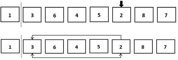 5) 如图 8 所示,2 和第二个元素交换位置后,第二个位置就成了这个有序数组的一部分。