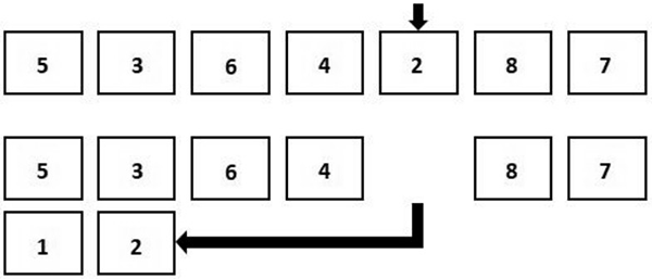 2) 如图 2 所示,我们继续对剩余元素进行遍历。这次,最小的元素是 2。我们把它添加到已排序的数组末尾。由于已在有序数组中的元素必定小于未排序数组中的所有元素,所以这步操作是正确无误的。