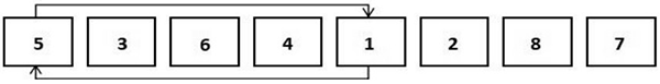 4) 接下来,如图 7 所示,由于第一个元素已经有序了,所以我们只需要在它之后的数组中搜索最小值。这一遍搜索过后,最小值是2,所以把2和第二个元素交换位置。