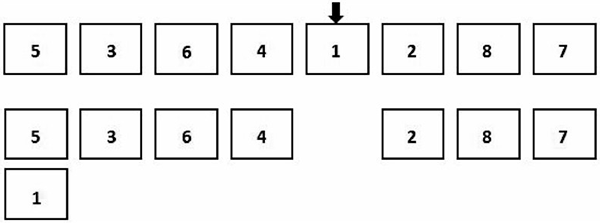1) 首先,如图 4 所示,在未排序的数组中找到最小的数 1。
