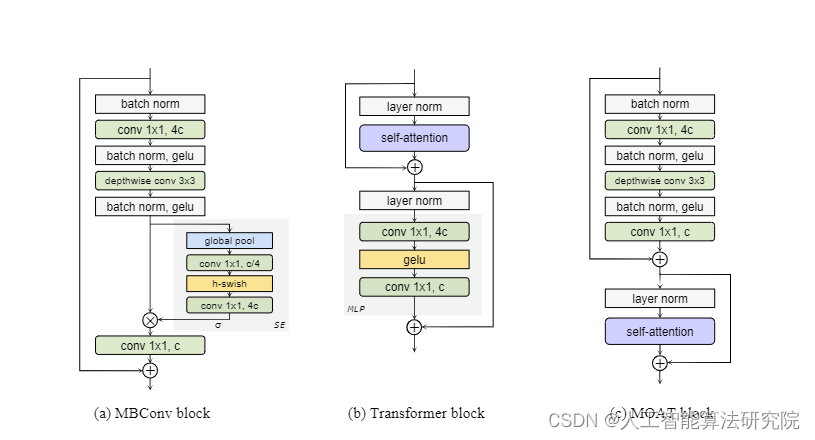 MOAT块 鉴于上述观察结果,我们现在尝试设计一个新块,有效地合并MBConv和Transformer块中的最佳块。我们从功能强大的Transformer块开始,并逐步完善。根据第一次观察,MBConv和Transformer模块都采用了“反向瓶颈”设计。由于深度卷积可以有效地编码像素之间的局部交互,这对于在ConvNets中建模平移等方差至关重要,因此我们开始将深度卷积添加到Transformer的MLP模块。然而,在我们在卷积之间添加额外的规范化和激活之前,我们没有观察到任何性能改进。对于第二个观察结果,我们只是没有将SE模块添加到MBConv块中。保持自我关注操作以捕获全局信息。我们发现第三个观察结果很关键。变压器块中自我注意操作之前的降采样操作(平均池)略微降低了其表示能力。另一方面,MBConv块经过精心设计,可用于跨深度卷积的下采样操作,有效学习每个输入通道的下采样卷积核。因此,我们在自我注意操作之前进一步对“反向瓶颈”(包含深度卷积)重新排序,将下采样操作委托给深度卷积。这样,我们不需要额外的下采样层,如CoAtNet(Dai等人,2021)中的平均池,或SWN(Liu等人,2021)和ConvNeXt(Liu等,2022b)中的面片嵌入层。最后,它产生了我们的MObile卷积与ATtention(MOAT)块 。