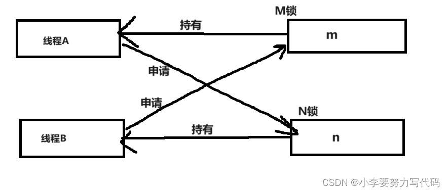 如果多个线程要调用多个对象,则在上锁的时候可能会出现“死锁”。例如:A、B两个线程会同时使用到两个共享变量m和n,同时每个变量都有自己相应的锁M和N。这时A线程首先拿到M锁访问m,接下来他需要拿N锁来访问变量n;而如果B线程拿着N锁等待着M锁的话,就造成了线程死锁。
