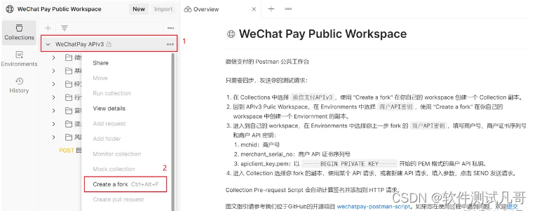 在该工作台中,你只需要将名为 WeChatPay APIv3 的集合 fork 到自己的工作台,然后就可以在 Postman 上构造并发送微信支付 APIv3 请求。