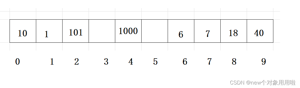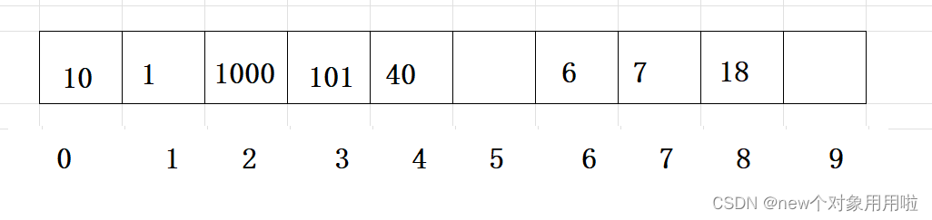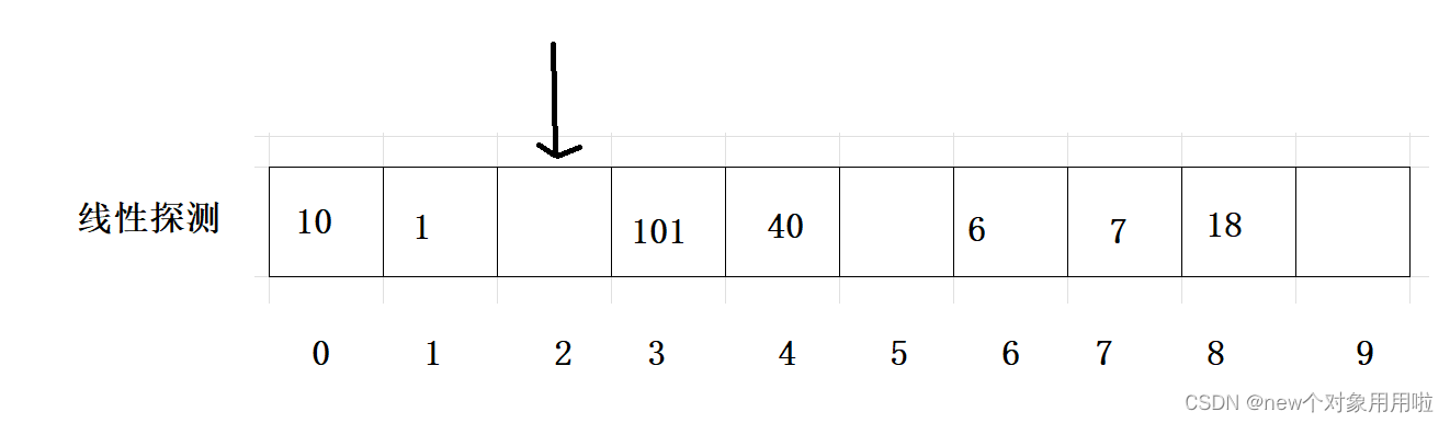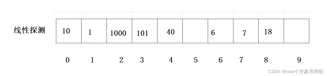 列如,我们用除留余数法将序列{1,6,10,1000,101,18,7,40}插入到表长为10的哈希表中,当发生哈希冲突时我们采用闭散序列的线性探测找到下一个位置进行插入,如下: