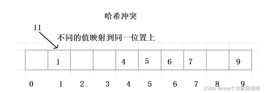 列如,在上述列子中,再将元素11插入当前的哈希表就会产生哈希冲突.因为元素11通过该哈希函数得到的哈希地址于元素1相同,都是下标为1的位置.