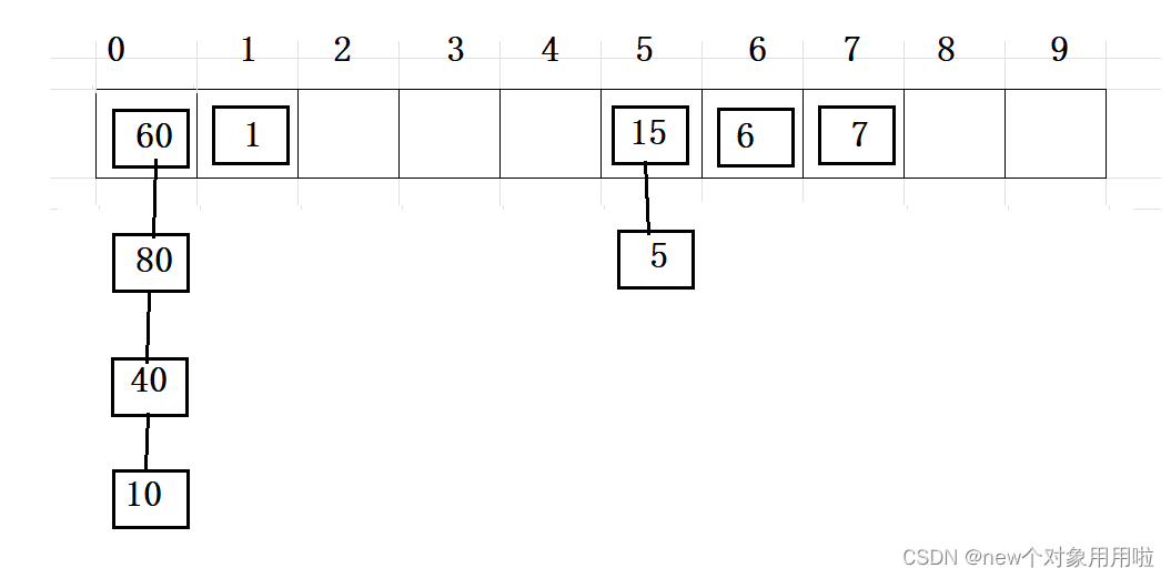 列如,我们用除留余数法将序列 {1,6,15,60,80,7,40,5,10}插入到表长为10的哈希表中,当发生哈希冲突时我们采用开散列的形式,将哈希地址相同的元素都链接到同一个同下.插入过程如下: