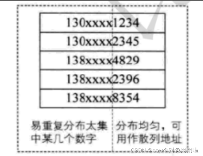 假如要存储某家公司员工登记表,如果用手机号作为关键字,那么极有可能前七位都是相同的,那么我们可以选择后面四位作为哈希地址.