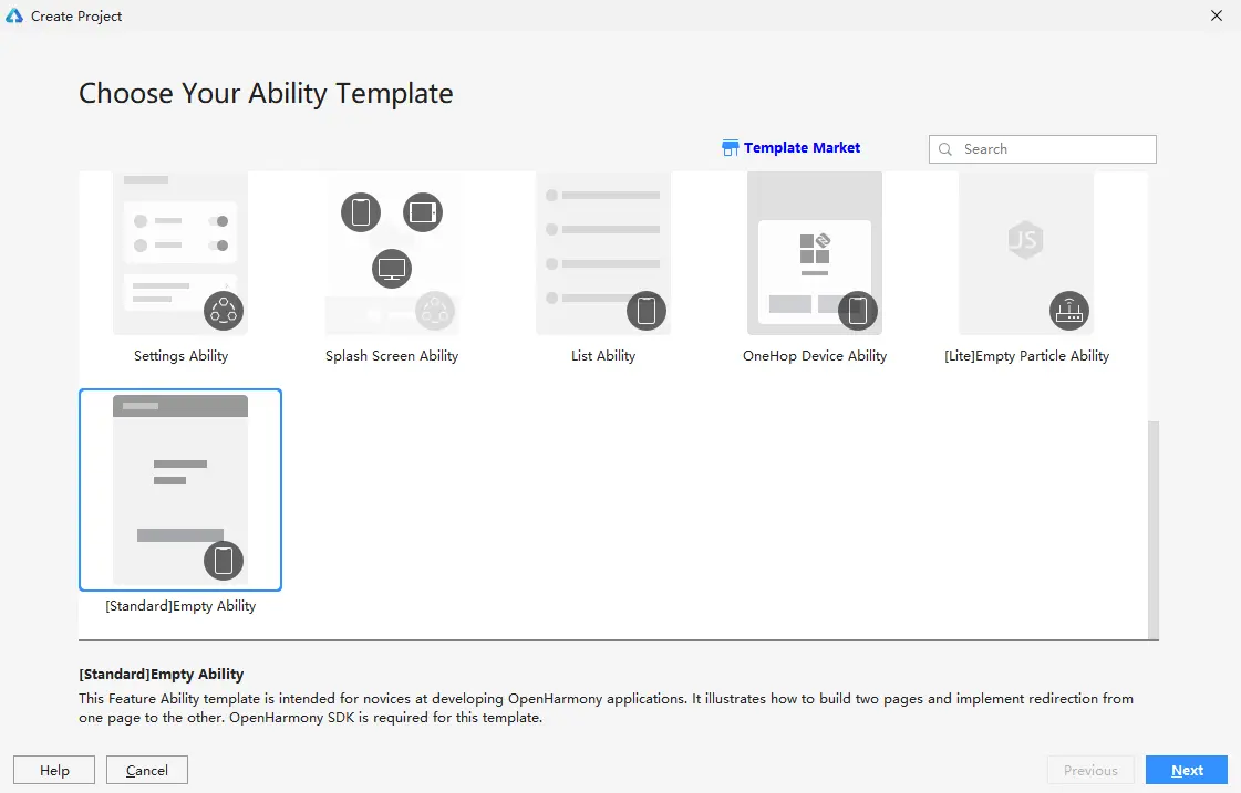 在DevEco Studio中点击File -> New Project ->[Standard]Empty Ability->Next,Language 选择ETS语言,最后点击Finish即创建成功。